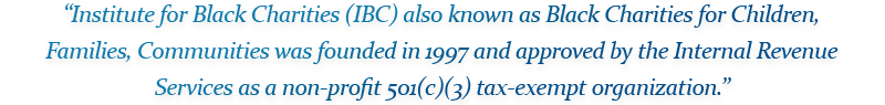 Institute for Black Charities serves as an agent for philanthrophy and philanthropic causes. As a repository, we collect and distribute vital resources to the poor and disenfranchised, and in turn, we provide programs that improve the quality of life for children, families and communities in need.